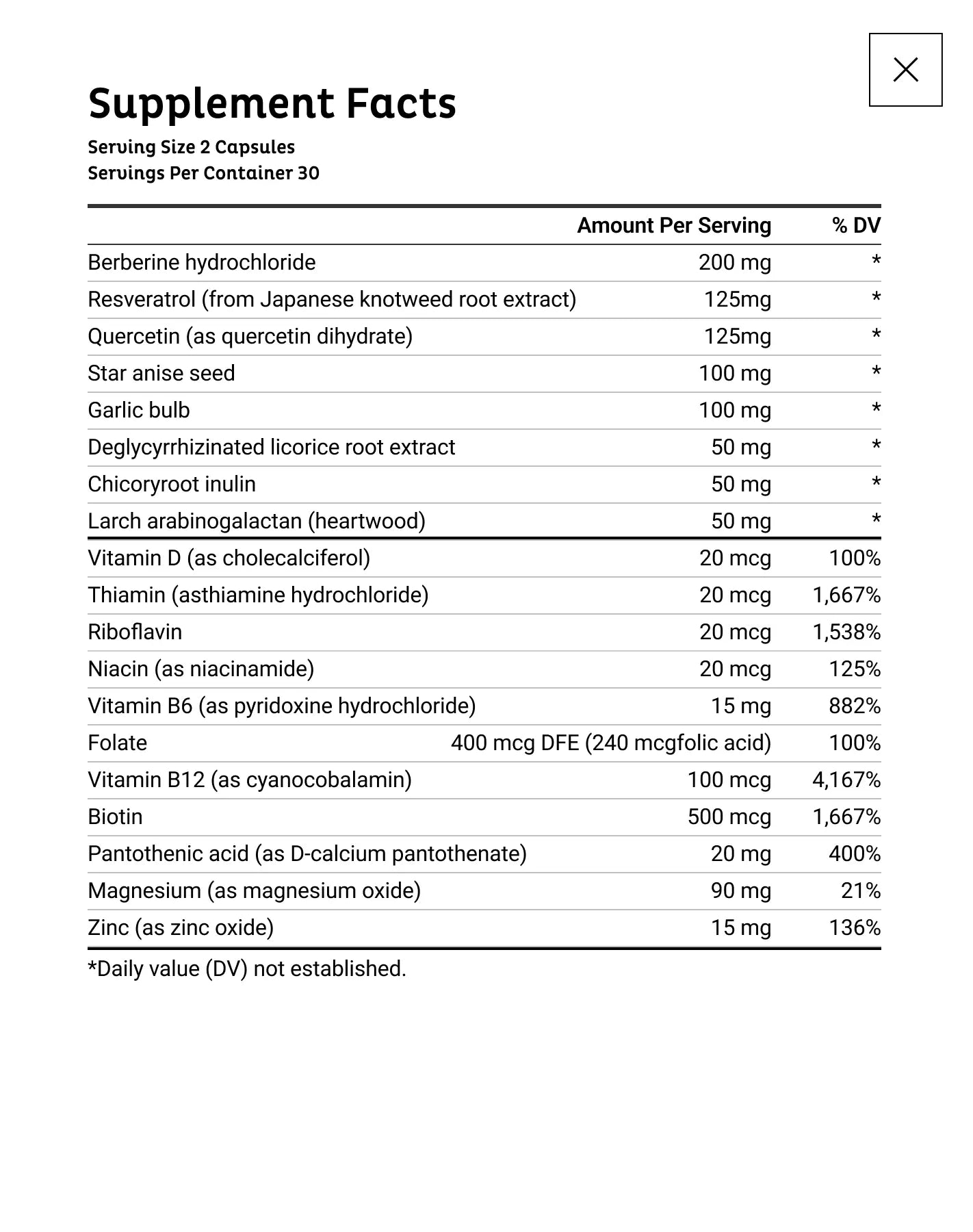 Deglycyrrhizinated Licorice (DGL), Quercetin, Berberine, Star Anise, Reservatrol, Chicory Root Inulin